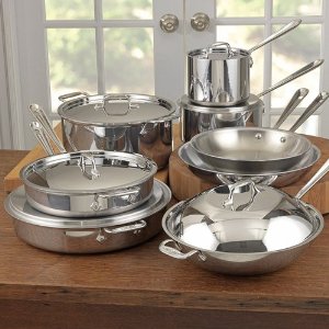 All Clad 14 Piece Tri-Ply Stainless Steel Cookware Set.